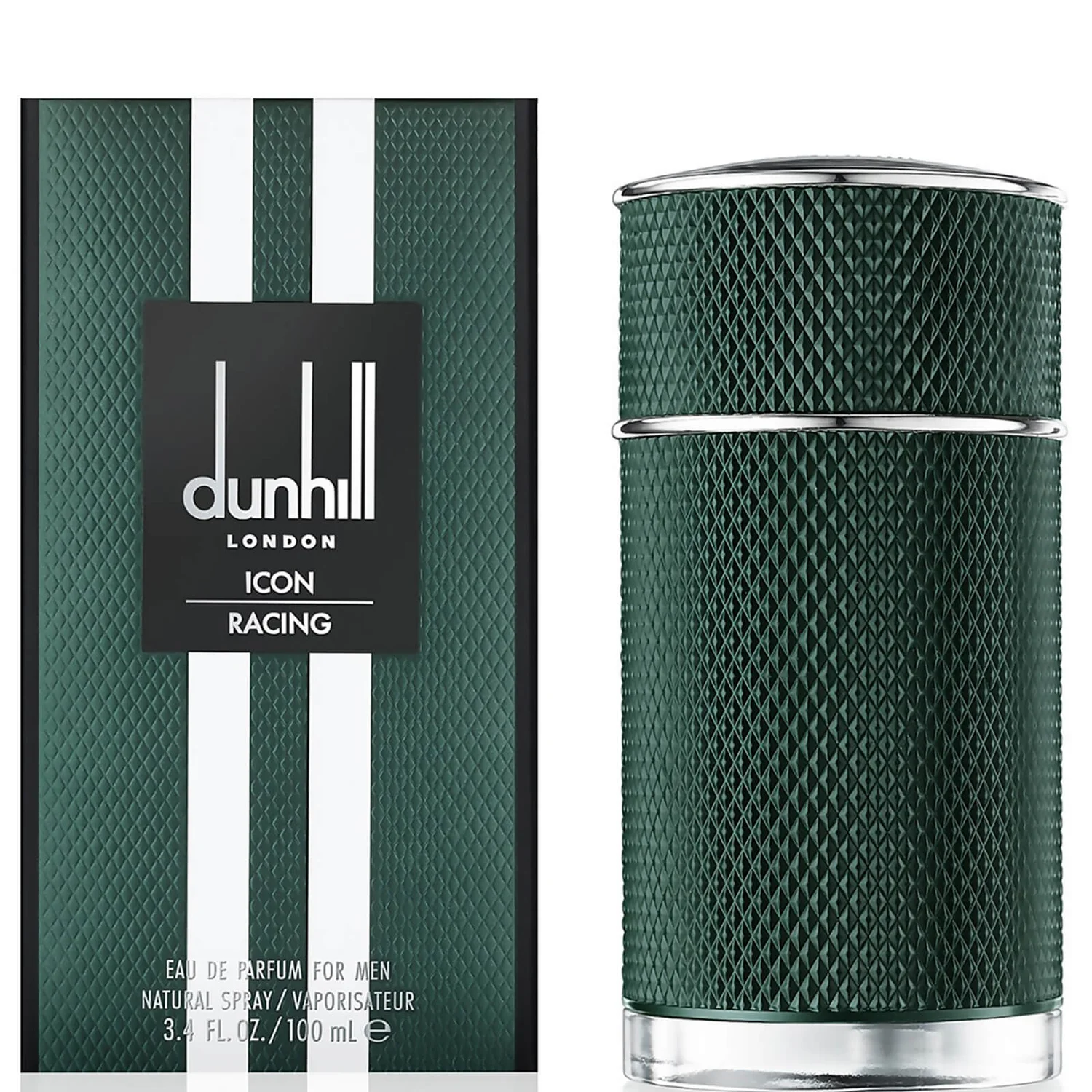 Housed in a classic dark green bottle, the design is finished with dunhill’s signature ‘Engine Turn’ style. In keeping with the theme, the top of the bottle, beneath the cap, fashions racing stripes.