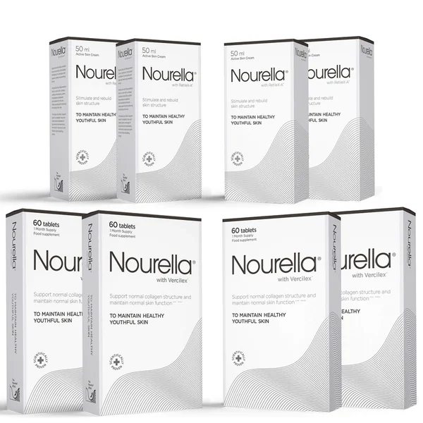 The Nourella® System 4 Month Bundle is a unique combination to transform your skincare regime, utilising dual-phase tablets and cream, which work in synergy to help stimulates and support the natural skin rebuilding and repair process.