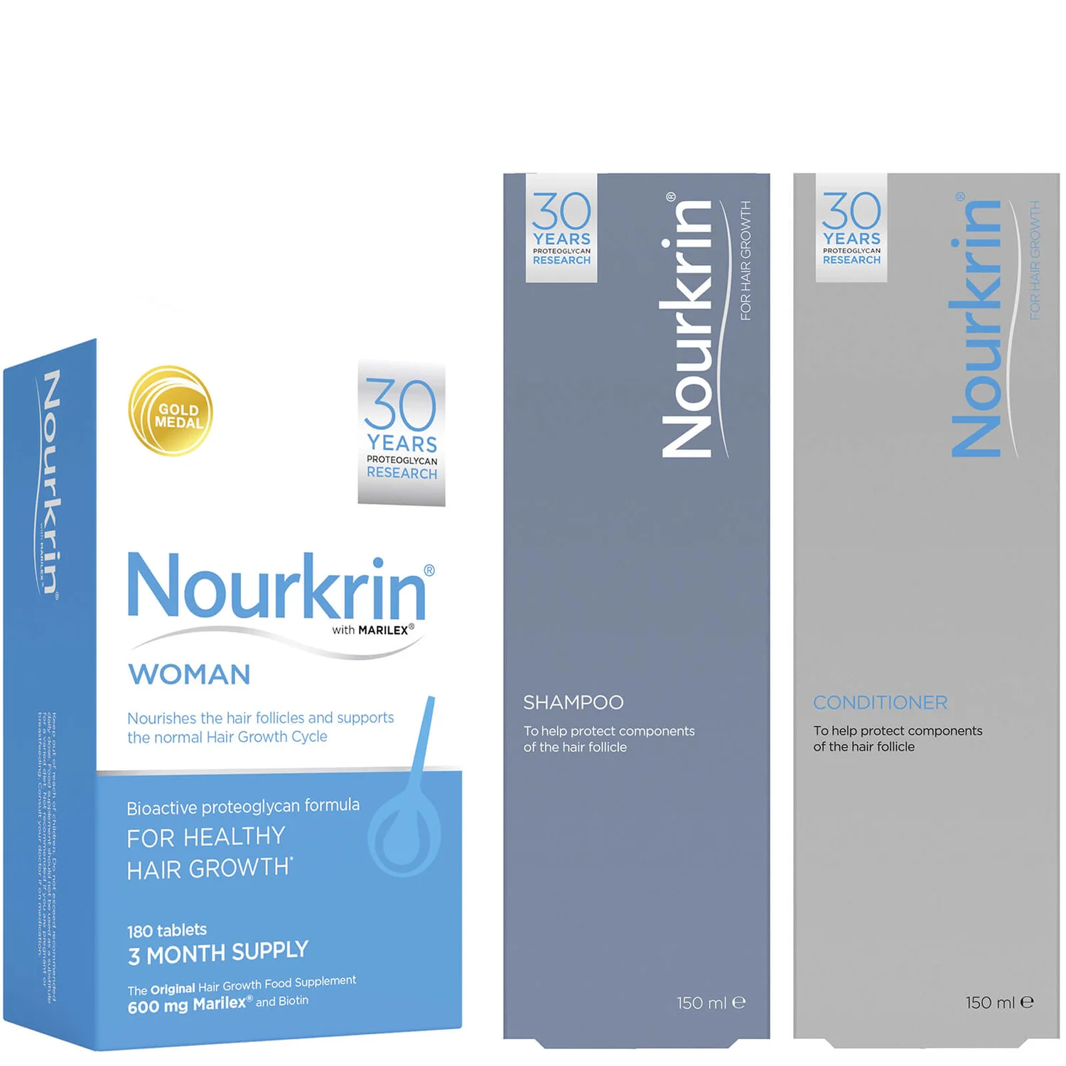 Promote a healthy head of hair with loss and thinning with the Nourkrin Woman Hair Growth Supplements 6 Month Bundle with Shampoo and Conditioner; a six month supply in a convenient value pack. Combining a daily food supplement with a shampoo and conditioner, the set has been carefully curated to help support and maintain a healthy hair growth cycle.